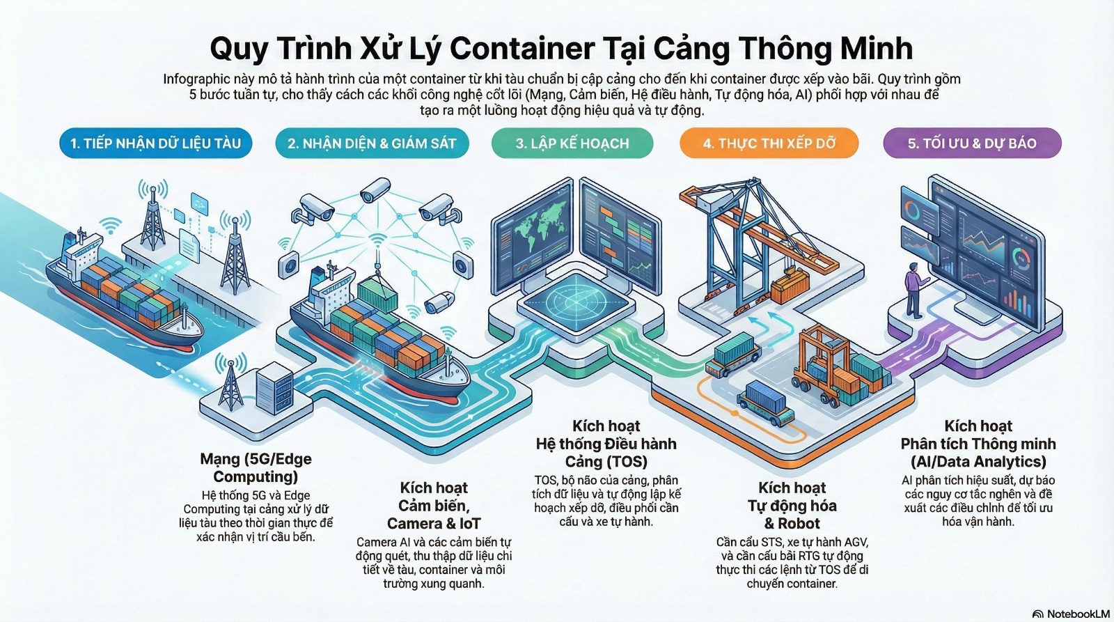Giải pháp mô phỏng và triển khai quy trình vận hành container theo 5 bước chính: