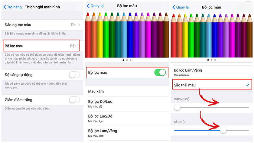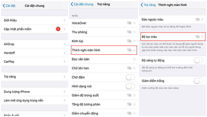Bước 1: Bạn truy cập Cài đặt (Settings) > Chung (General) > Trợ năng (Accessibility) > Thích nghi màn hình (Display Accommodations) > Bộ lọc Màu (Color Filters).