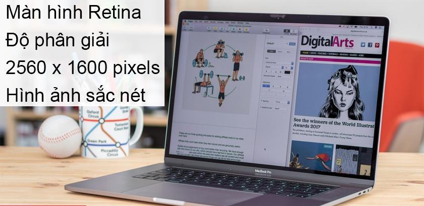 Apple cũng trang bị cho Macbook Pro 2017 màn hình hiển thị hoàn hảo với công nghệ màn hình Retina sắc nét, màu sắc chân thực nên sẽ vô cùng thích hợp để xử lý các công việc như đồ họa, chỉnh sửa hình ảnh, video,… Độ phân giải cao 2560 x 1600 pixels và đèn LED hỗ trợ tăng cường độ tương phản, giúp mang đến màu đen đậm hơn, màu trắng sáng hơn và nhờ đó hình ảnh hiển thị sẽ tinh tế, tươi tắn hơn.